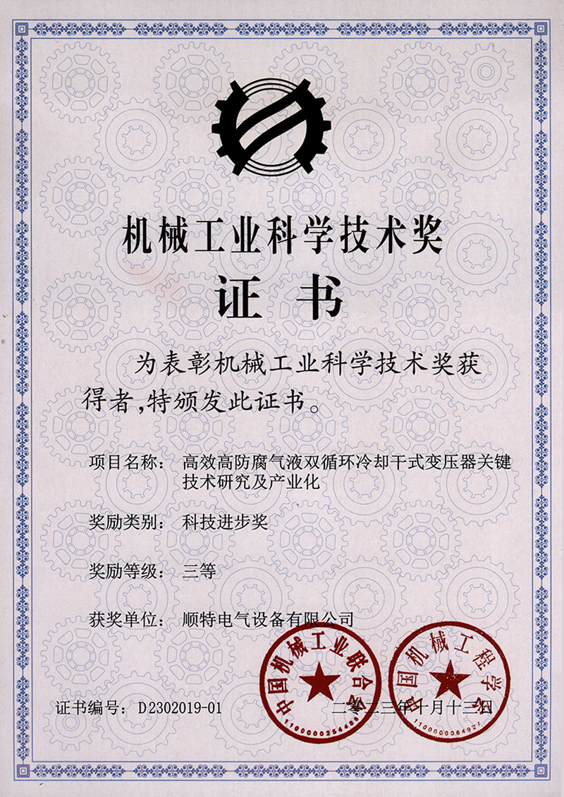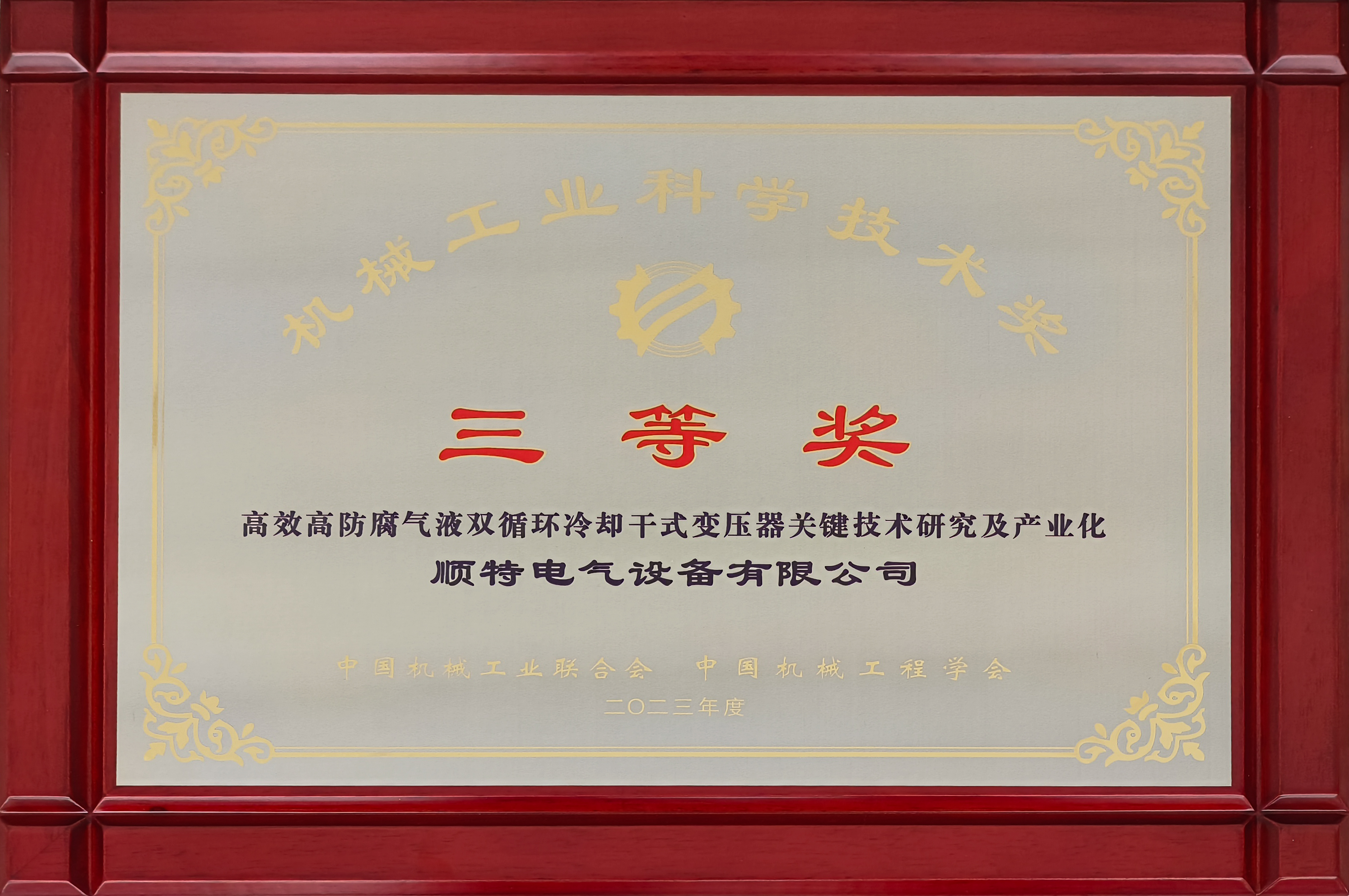 近期,中國機械工業(yè)聯(lián)合會和中國機械工程學會聯(lián)合公布了2023年度“機械工業(yè)科學技術(shù)獎”獲獎名單,順特電氣研發(fā)的“高效高防腐氣液雙循環(huán)冷卻干式變壓器關(guān)鍵技術(shù)研究及產(chǎn)業(yè)化”項目榮獲2023年中國機械工業(yè)科技進步獎三等獎。