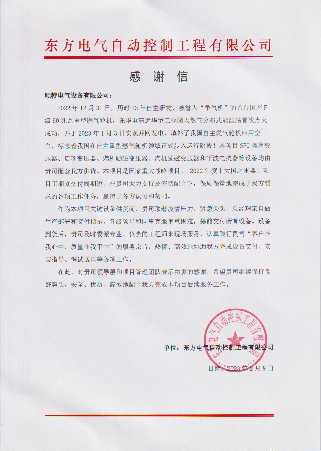 順特電氣作為該項(xiàng)目的SFC隔離變壓器、啟動變壓器、燃機(jī)勵磁變壓器、汽機(jī)勵磁變壓器和平波電抗器等關(guān)鍵設(shè)備的供應(yīng)商,在合同履行的過程中頂著疫情封控等壓力,在緊急關(guān)頭,各級領(lǐng)導(dǎo)和同事克服重重困難,提前交付所有設(shè)備,并派出專業(yè)資深工程師到現(xiàn)場服務(wù),踐行“客戶在我心中,質(zhì)量在我手中,合作立足共贏”的核心價值觀,高效協(xié)助東方自控完成設(shè)備交付、安裝指導(dǎo)、調(diào)試送電等各項(xiàng)工作。2023年2月,東方自控特向我司發(fā)來感謝信,對我司領(lǐng)導(dǎo)層和項(xiàng)目管理團(tuán)隊(duì)表示由衷的感謝。