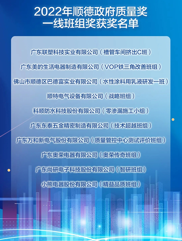 獲得“2022年順德政府質量獎一線班組獎”,是政府對順特電氣在創(chuàng)建先進質量管理模式、推行先進質量理念、踐行科學質量管理方法等方面的高度肯定。接下來,我司將繼續(xù)學習借鑒先進質量管理經驗,不斷強化質量意識,持續(xù)提升質量管理水平,為順德建設質量強區(qū)、建設高質量發(fā)展先行示范區(qū)作出新的貢獻。